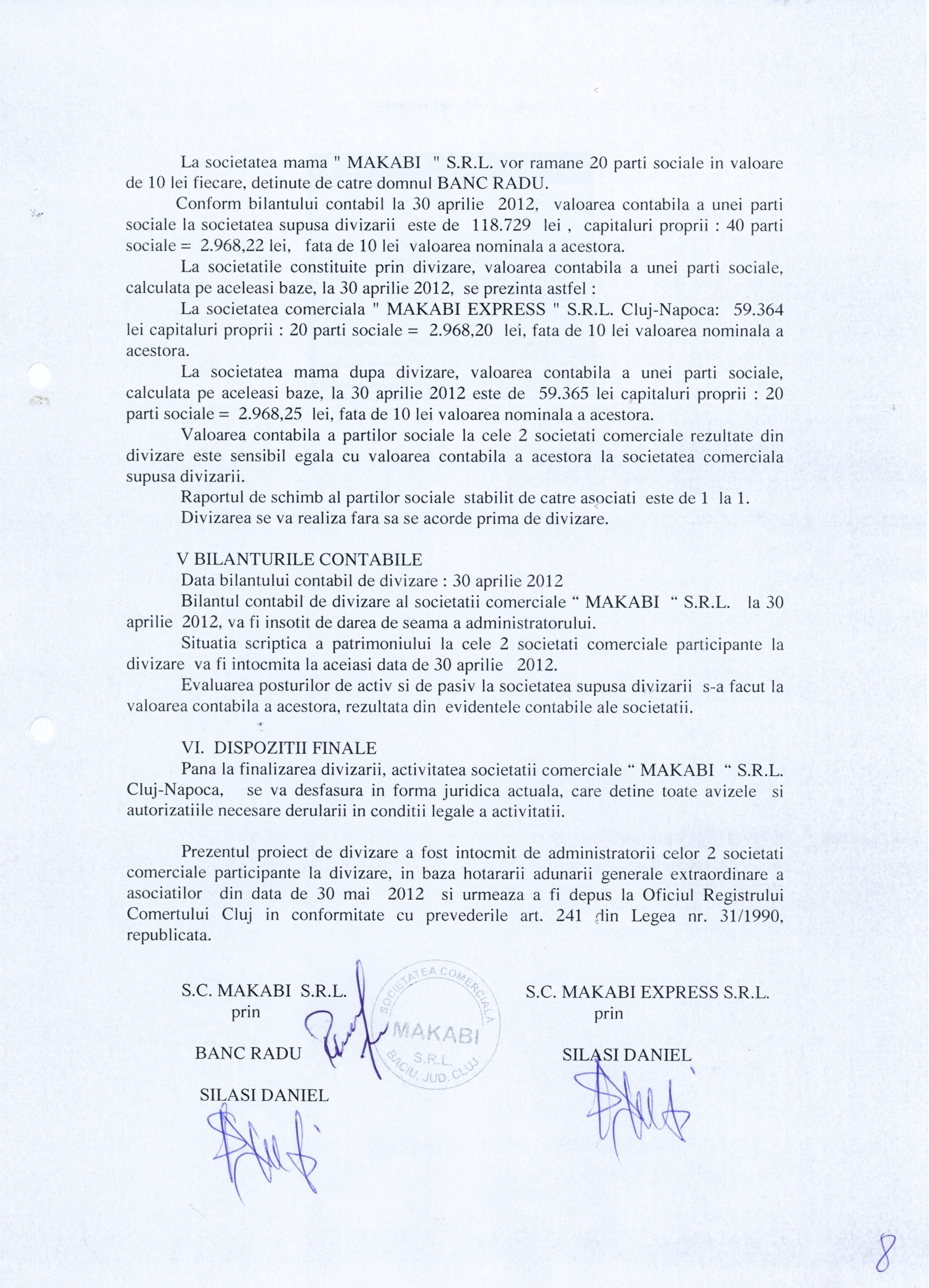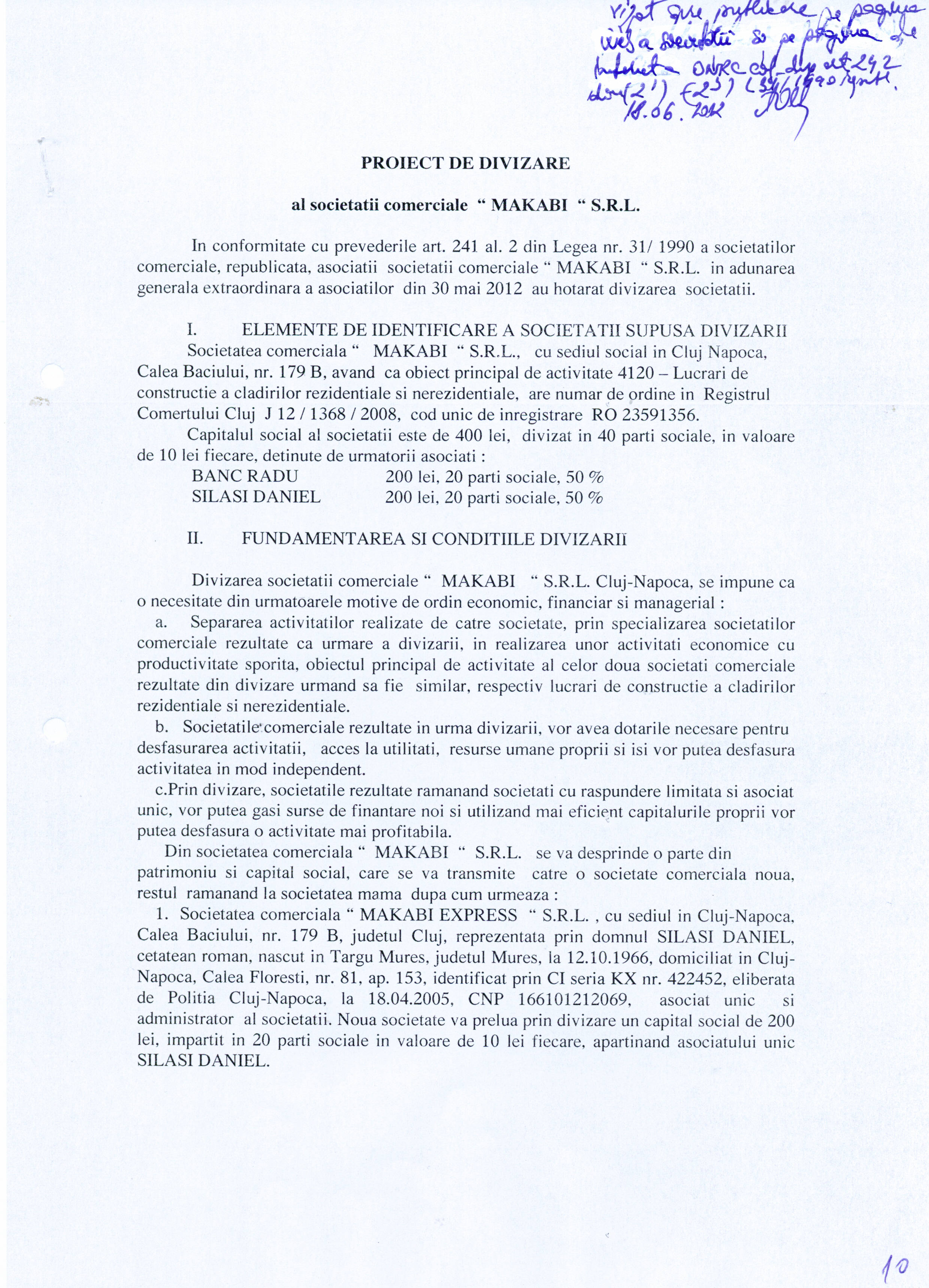 1. Proiect de divizare al societatii Makabi S.R.L. publicat la data de 21 iunie 2012 - www.makabi.ro