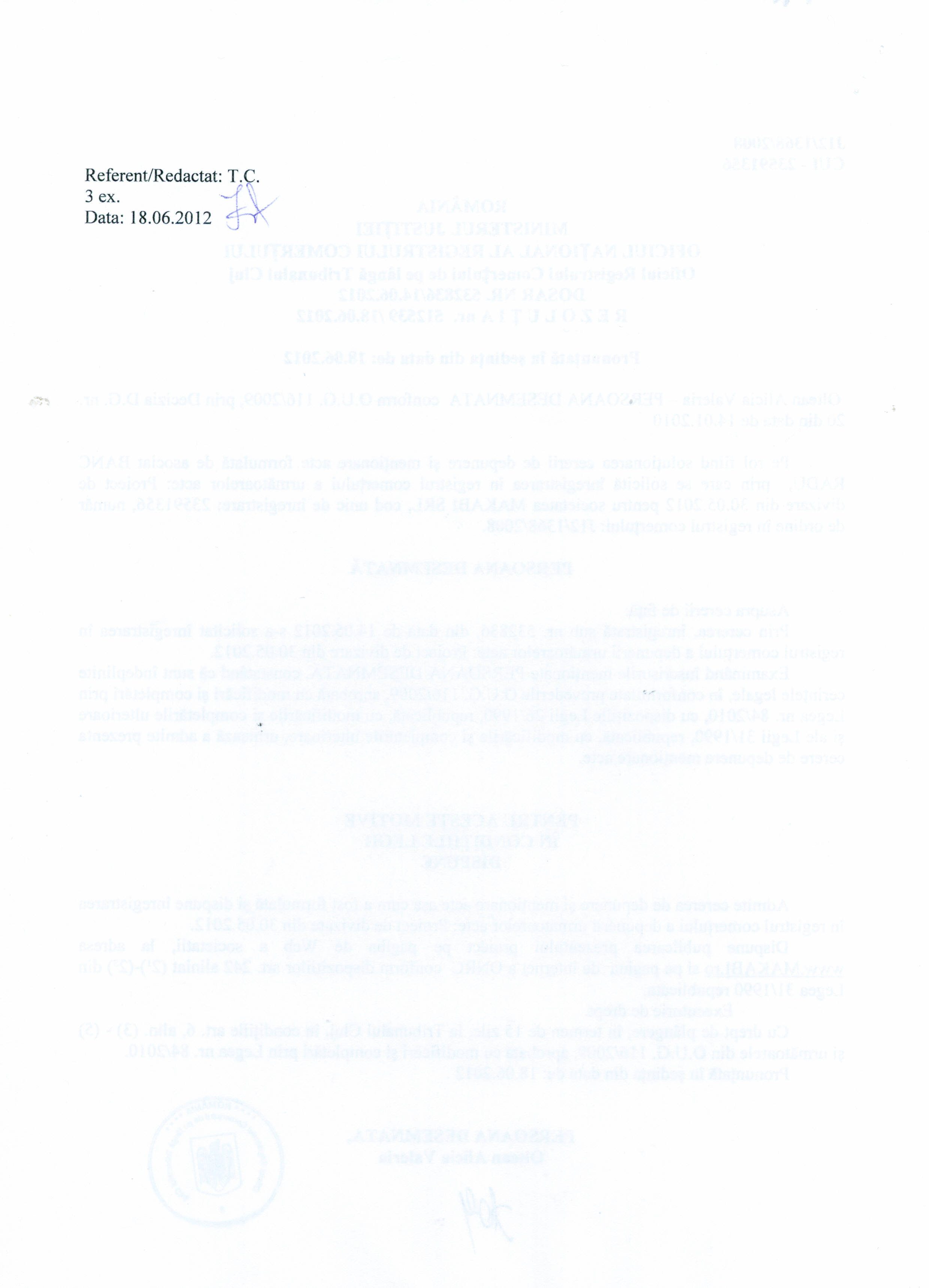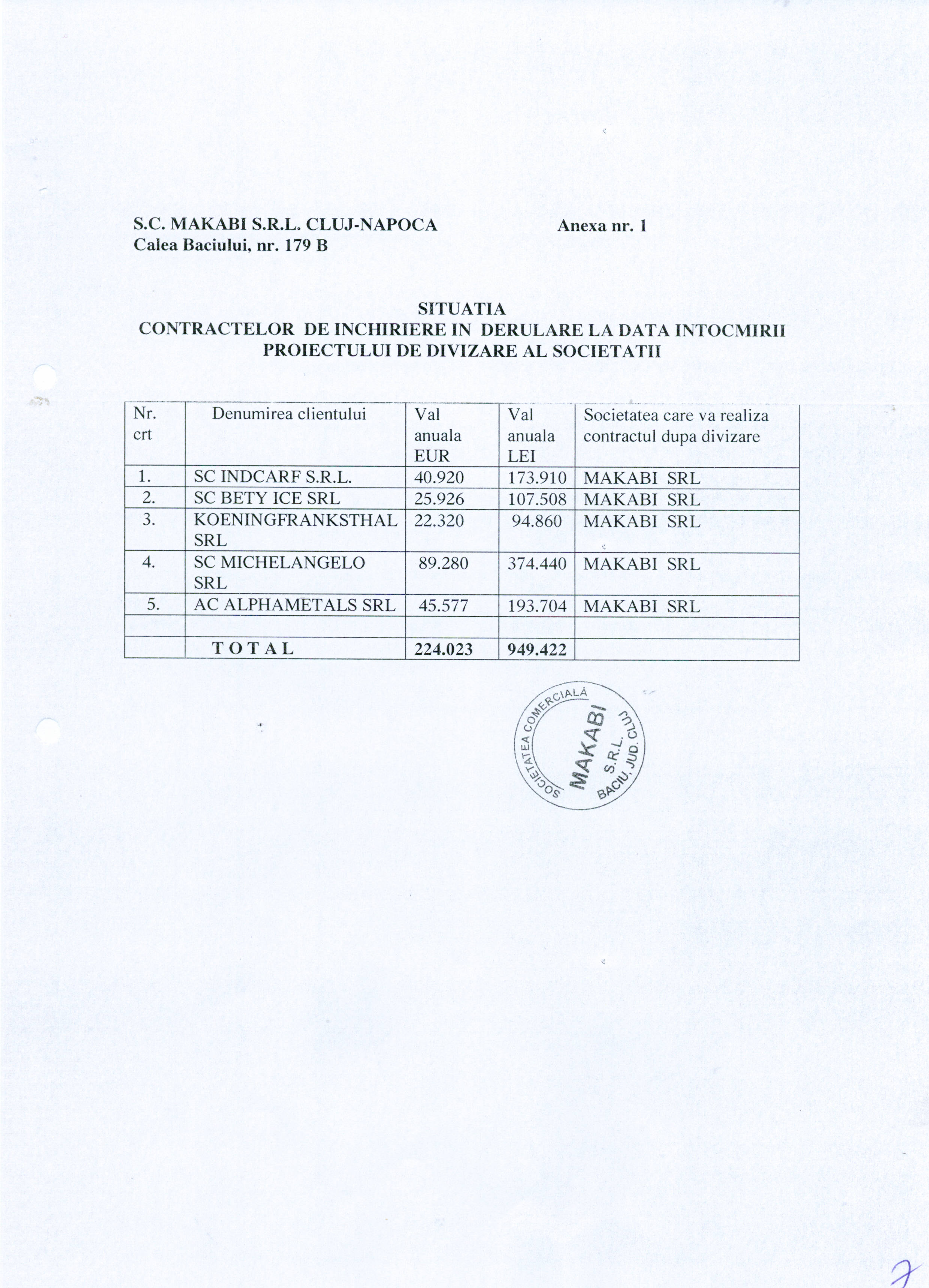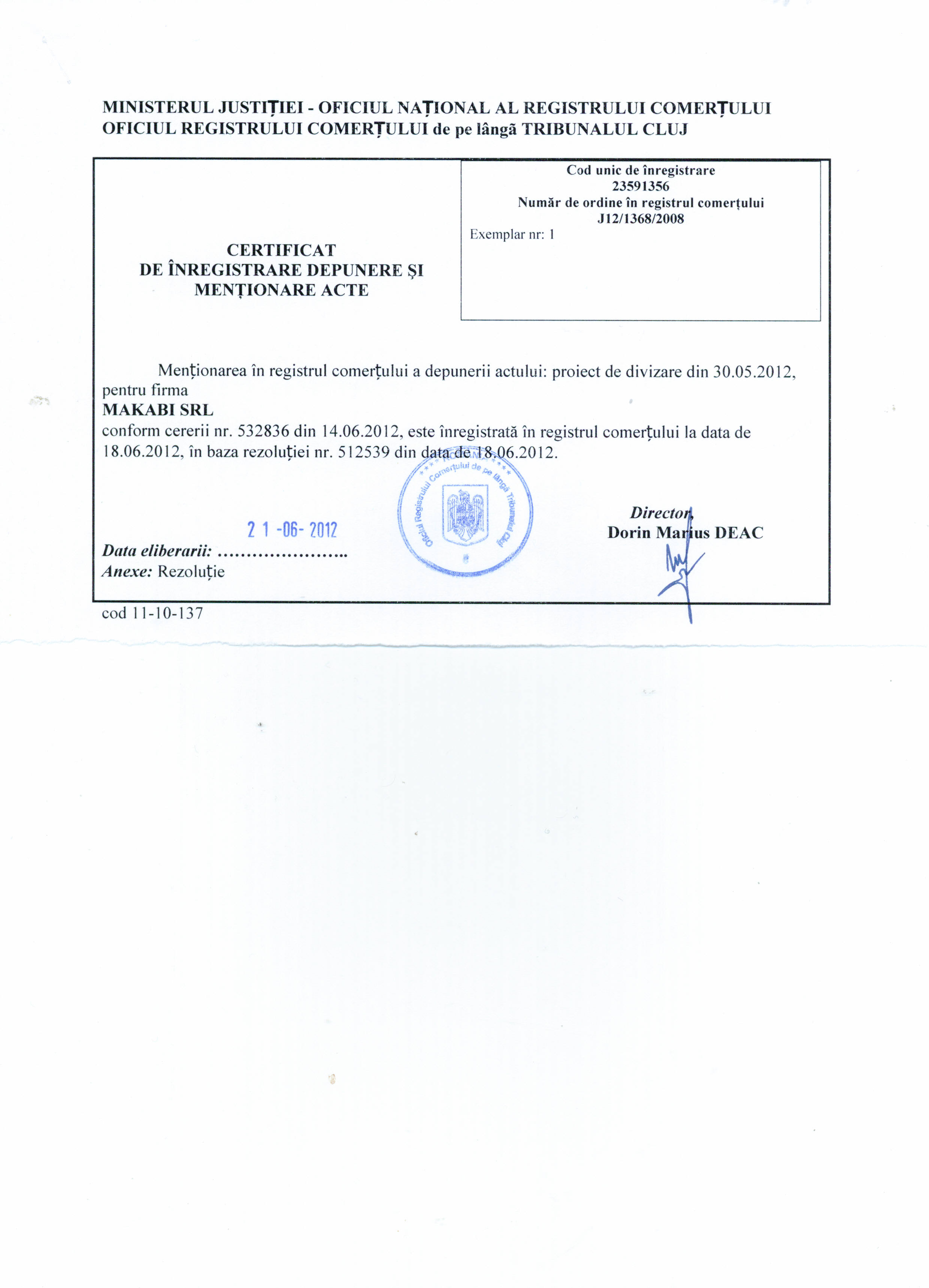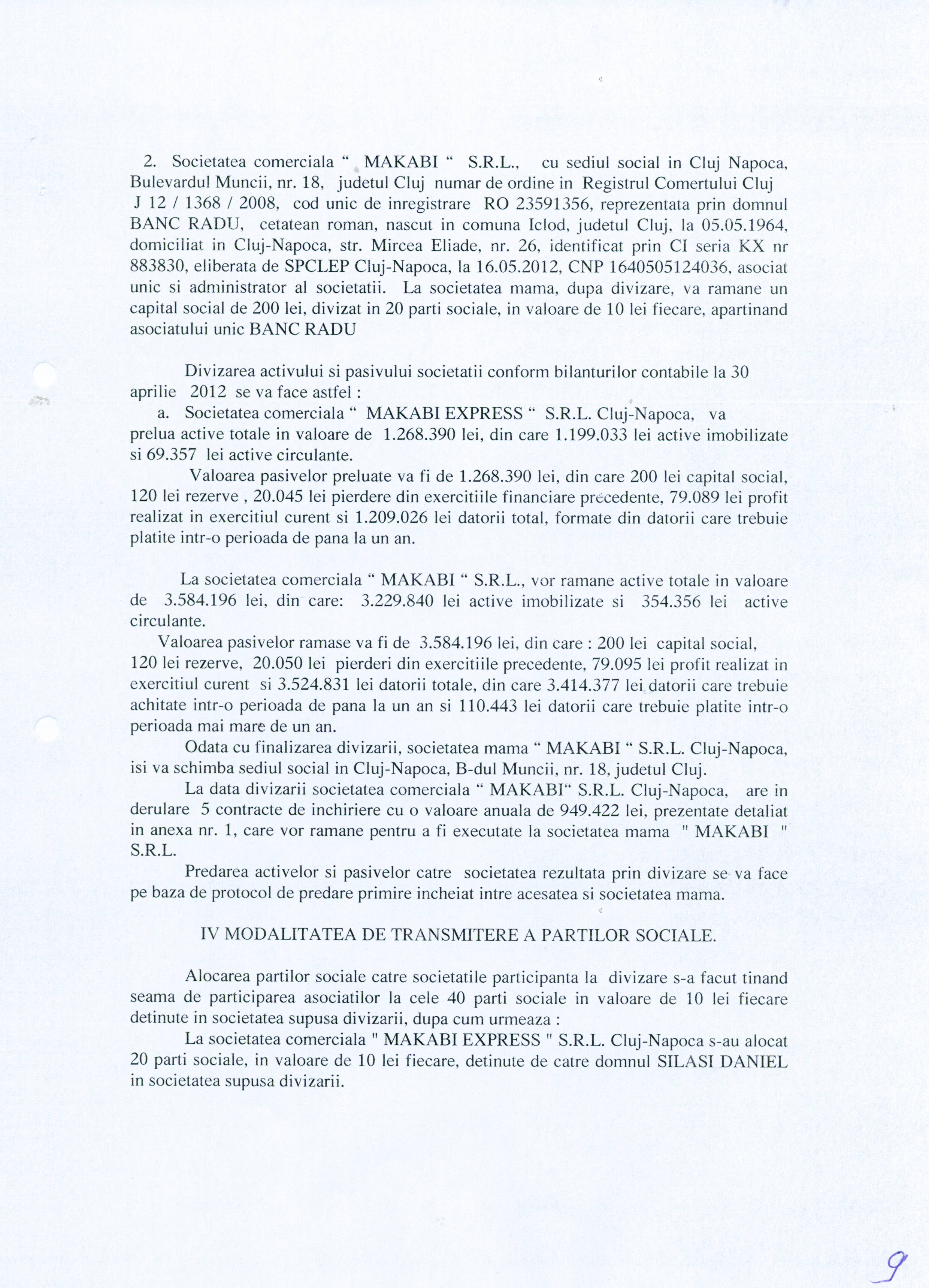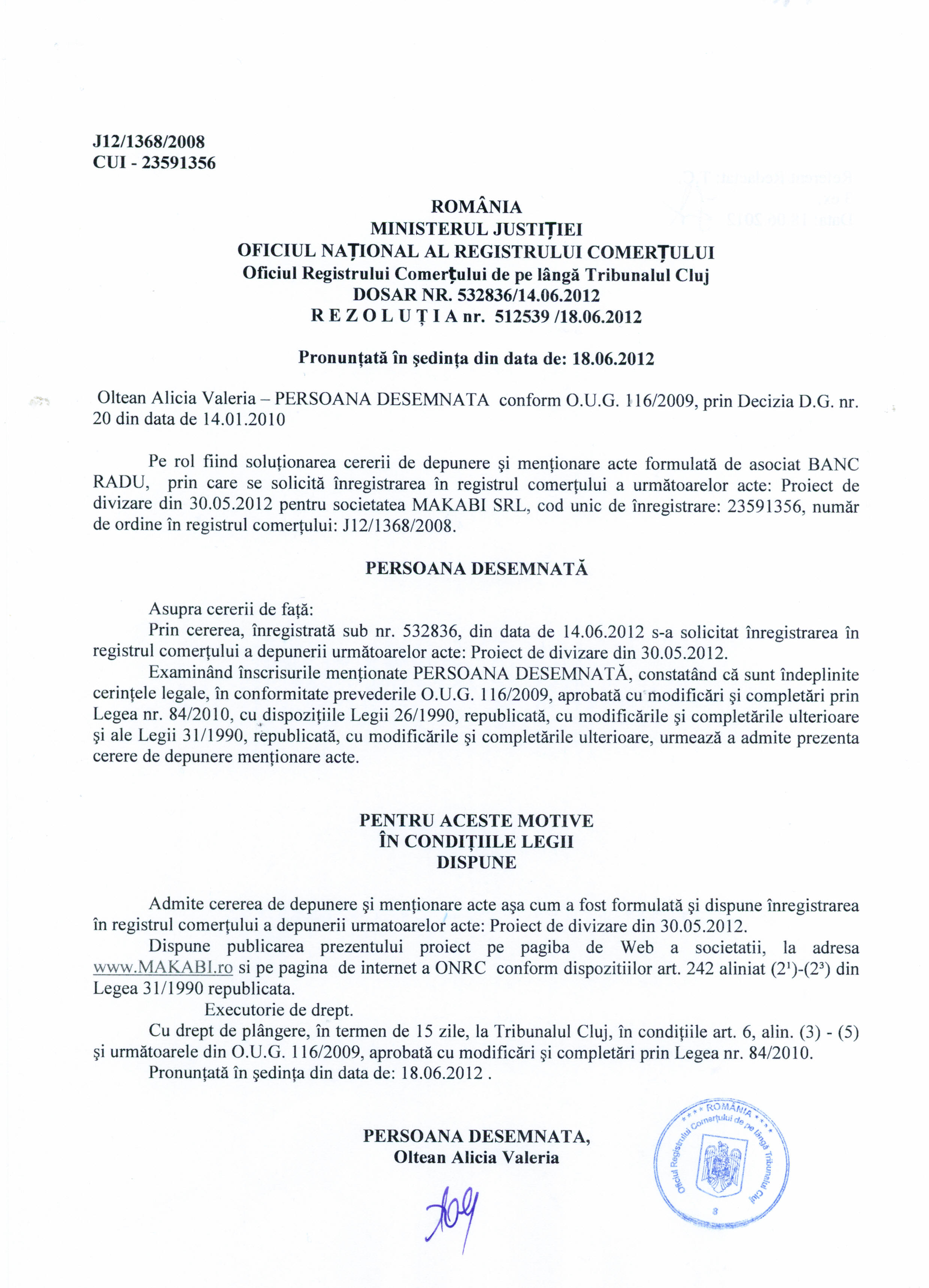1. Proiect de divizare al societatii Makabi S.R.L. publicat la data de 21 iunie 2012 - www.makabi.ro